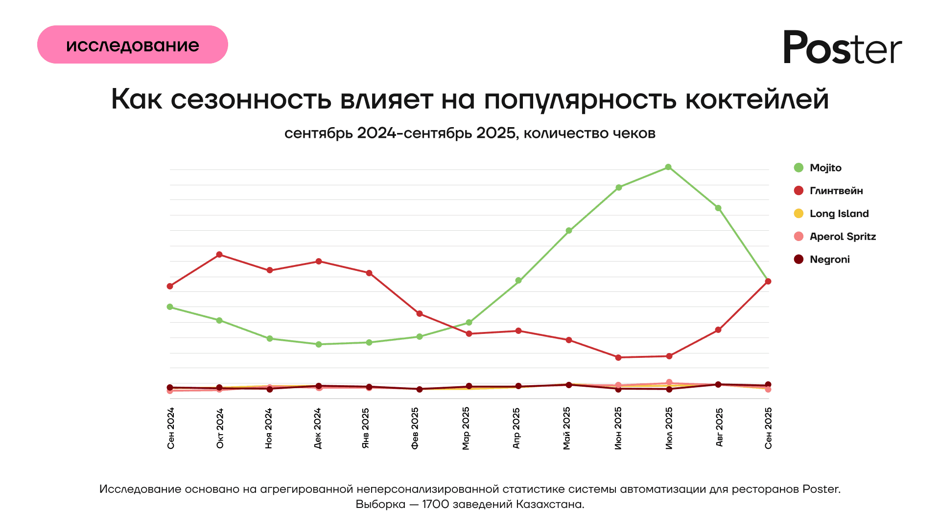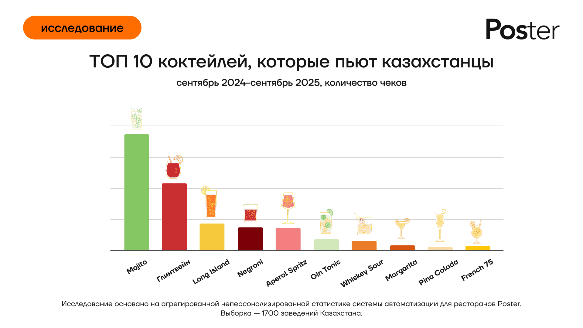 Компания по автоматизации общепита Poster проанализировала заказы в барах, кафе и ресторанах по всему Казахстану и составила рейтинг самых популярных коктейлей. В тройке фаворитов — Mojito, Глинтвейн и Long Island. Исследование также показало, как влияет сезонность на популярность напитков.