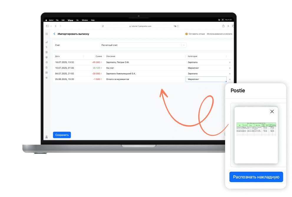 Загрузите в Postie выписку из любого банка в формате CSV, XLS или PDF — и ассистент распознает финансовые транзакции и создаст их в Poster. Ставит категорию по получателю, плательщику или назначению платежа. Если не угадает — запомнит ваш выбор для следующего раза.